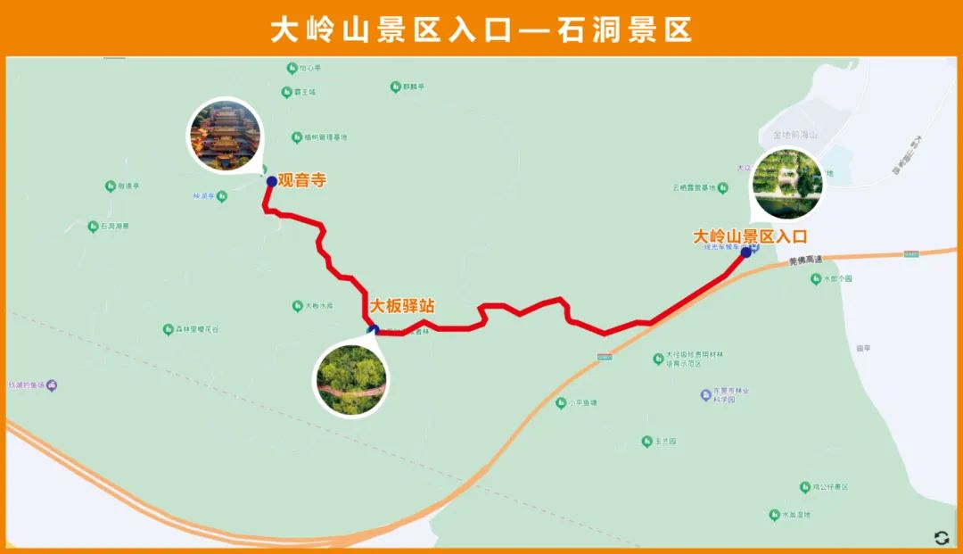 大岭山景区主入口、大板驿站、石洞廊(观音寺候车点)