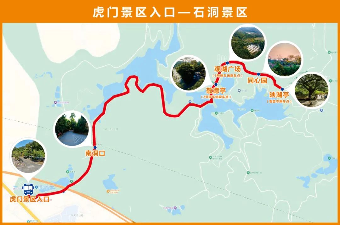虎门景区入口、南洞口、敬德亭(2号停车场候车点)、观湖广场(3号停车场候车点)、映湖亭(观音寺候车点)