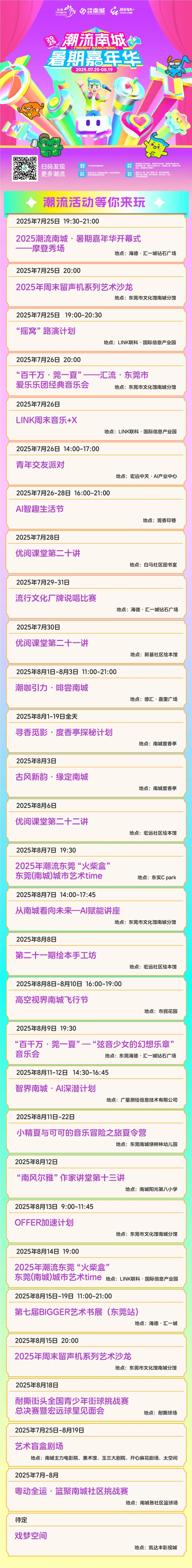 喜迎十五运,活力燃今夏。2025潮流南城·暑期嘉年华7月火热来袭。当“东莞之夏,与潮同行”,这句熟悉的slogan再次响起,一同迎接这个炽热的夏天吧!