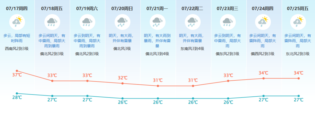 天气高温炎热,请注意防暑防晒;请注意防御局地雷雨大风等强对流天气。