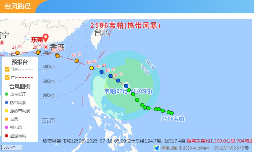 今年第6号台风“韦帕”已于7月18日凌晨在菲律宾以东洋面生成,最强可达台风级或强台风级,19日凌晨至上午移入南海北部海面,尔后逐渐向广东中部至海南岛东部一带沿海靠近。受台风影响,东莞从18日开始雷雨趋于明显,未来一周将有暴雨、局部大暴雨降水过程,沿海和高地最大阵风8到10级,请市民注意防御。
