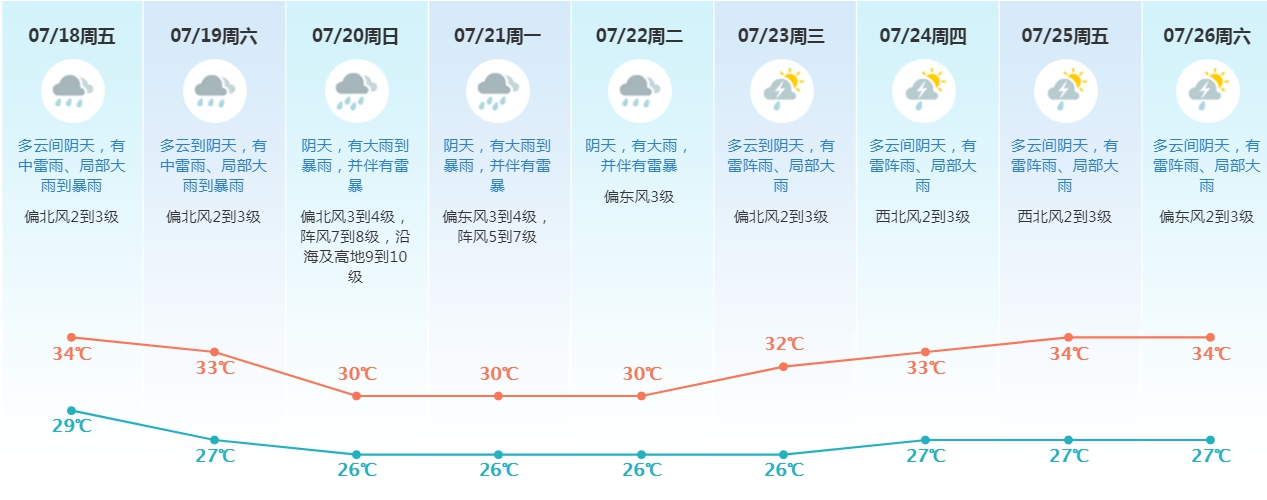 东莞市气象台预计18—19日东莞雷雨趋于明显,有中雷雨、局地伴有短时强降水、7到9级短时大风等强对流天气;20—22日受台风环流影响,将有暴雨、局部大暴雨降水过程,陆地最大阵风7到8级,沿海和高地8到10级;展望23—26日天气仍不稳定。
