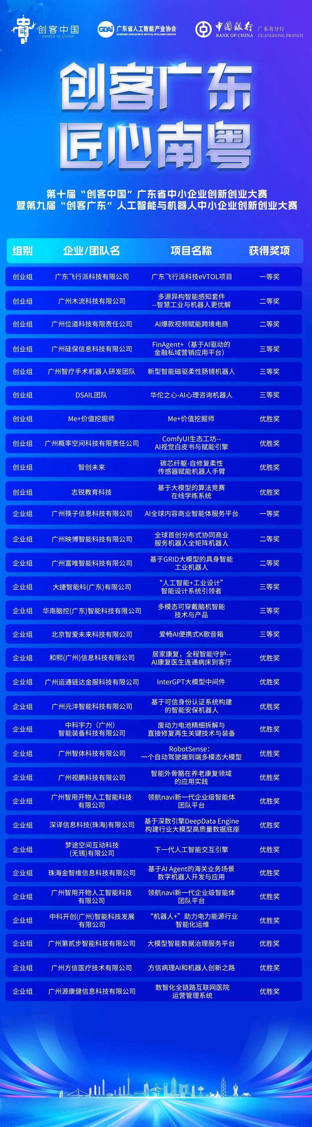 近日,第九届“创客广东”人工智能与机器人中小企业创新创业大赛决赛在东莞滨海湾港澳青年创新创业基地圆满收官。决赛汇聚省内外及港澳台、海外优质项目同台竞技。项目覆盖工业视觉检测、智能穿戴脑机设备、先进工业机器人、自动驾驶等前沿赛道,集中释放出硬核科技实力与澎湃创新活力。