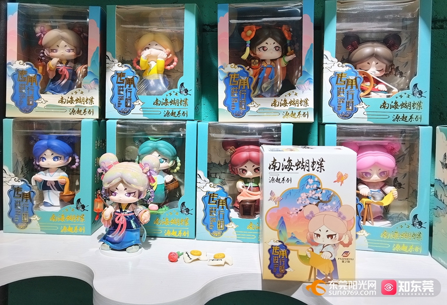 “这是南海蝴蝶系列,其亮点在于将中国传统特色与现代潮玩巧妙融合,蕴含着丰富的历史故事。这个是幻想生物系列,是具有吉祥寓意的动物,像鹿、龙等。”企业营销总监陈显向记者详细介绍。
