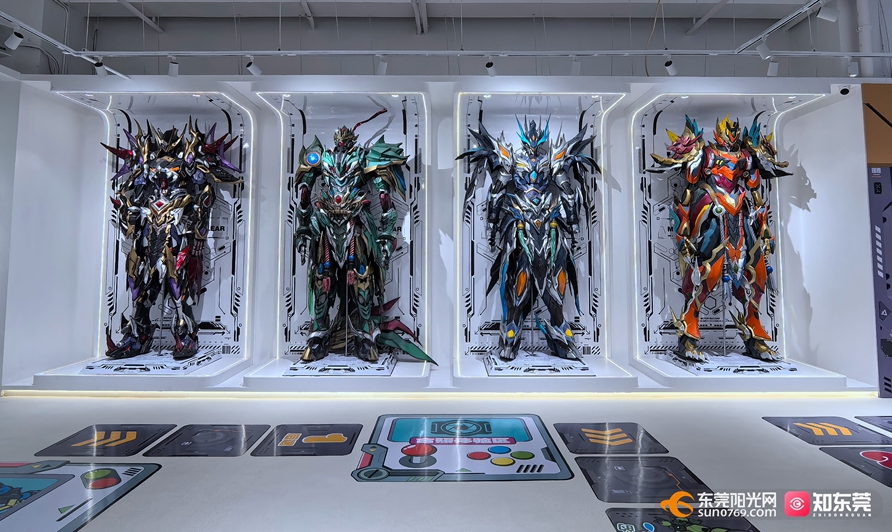 展厅还陈列了摩动核历年推出的产品系列,每一款都精心雕琢、独具风格,当中有不少是以中国传统文化中的名将英雄或神话人物命名,“我们将中国传统文化元素,如中式铠甲、雉翎、瑞兽等融入机甲设计当中,彰显出中国机甲独特的魅力和风采。”该公司副总经理任绿柳表示。