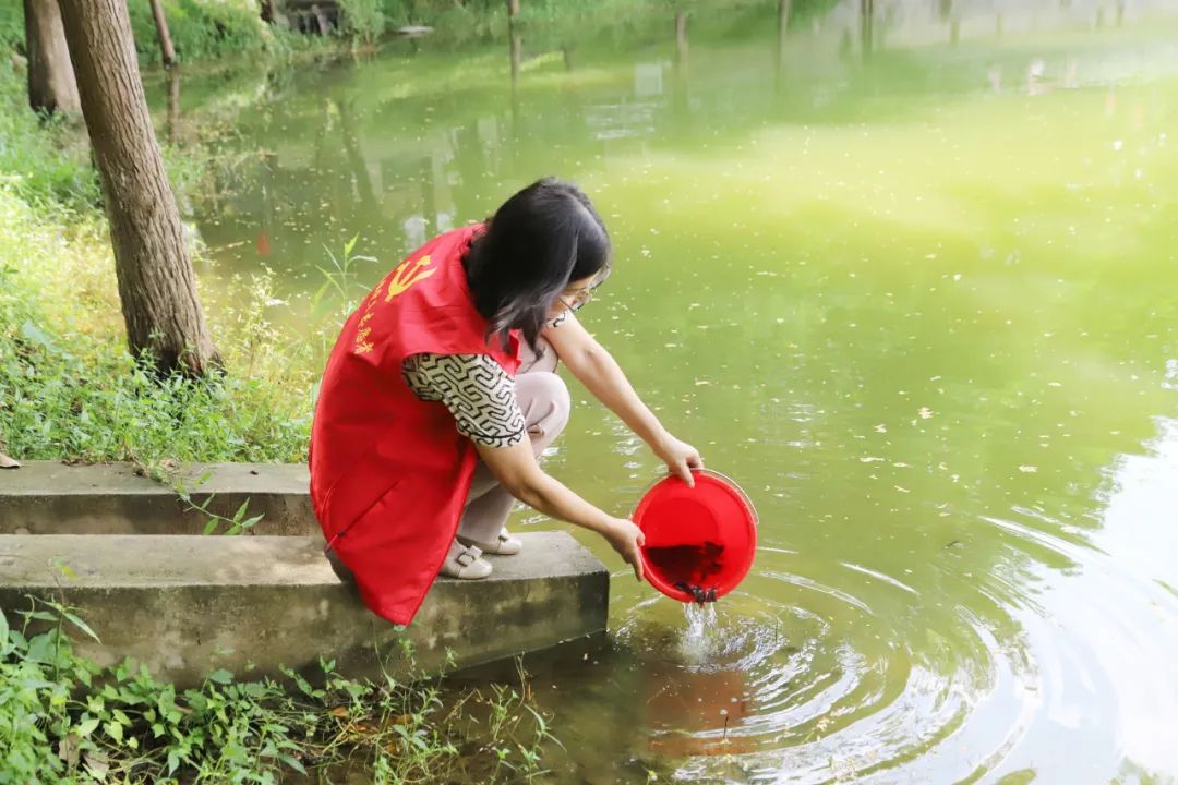 在育贤湖投放现场,谢岗镇人大副主席谢润珍和工作人员一起,逐批释放着体长3-5厘米的叉尾斗鱼。这些鱼苗甫一入水便迅速散开,潜入水生植物根系区域。
