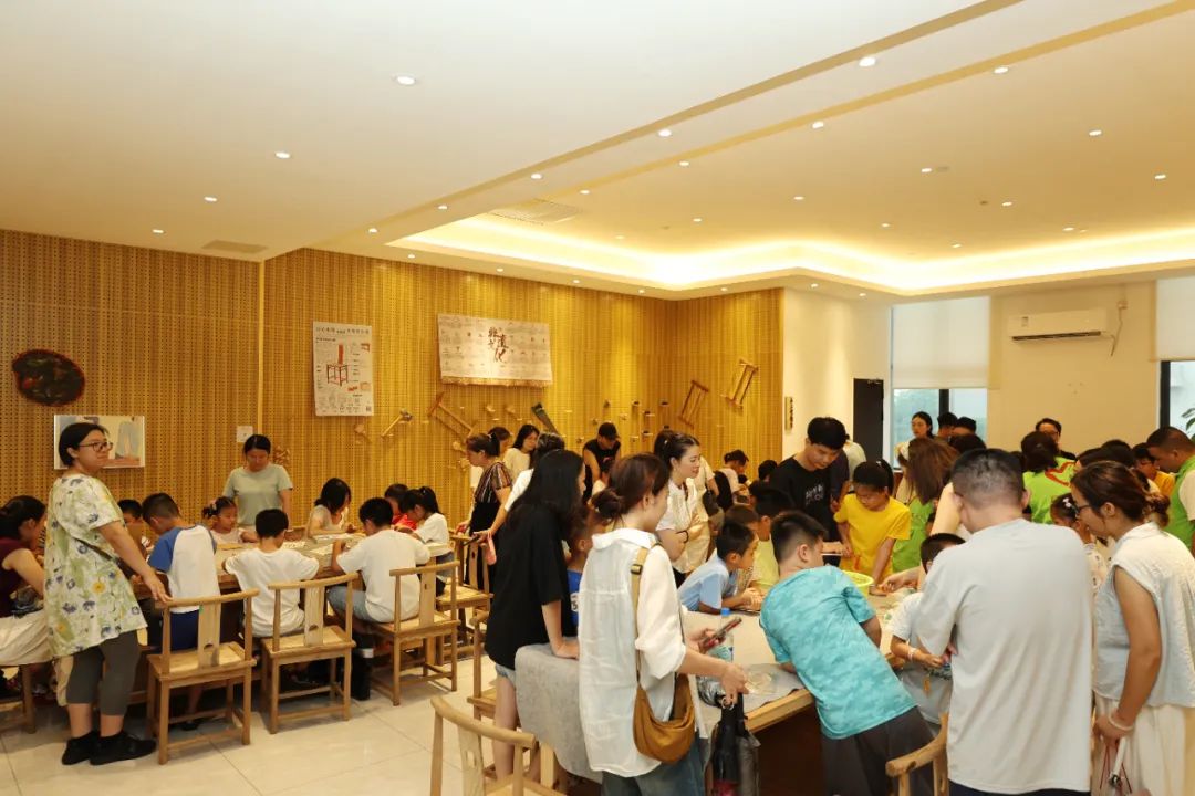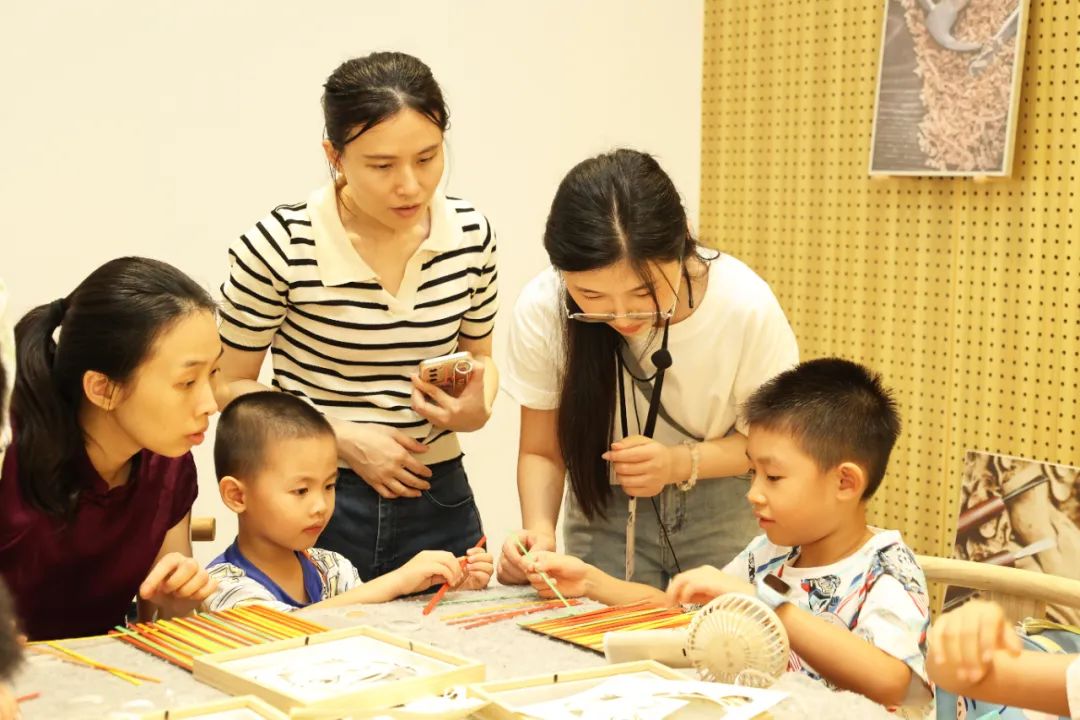 鲁班锁组装充满挑战,孩子们化身“小鲁班”,在老师指导下拆解组装榫卯模型,体验无钉连接奥秘。随后,大家变身“手作匠人”。月竹编画区里,七彩竹片在孩子们手中穿梭,经老师指导,竹编基底覆上纸雕,灵动作品渐次成型。漆扇专区人气高涨,亲子共调色彩、细绘图案,打造专属漆扇。