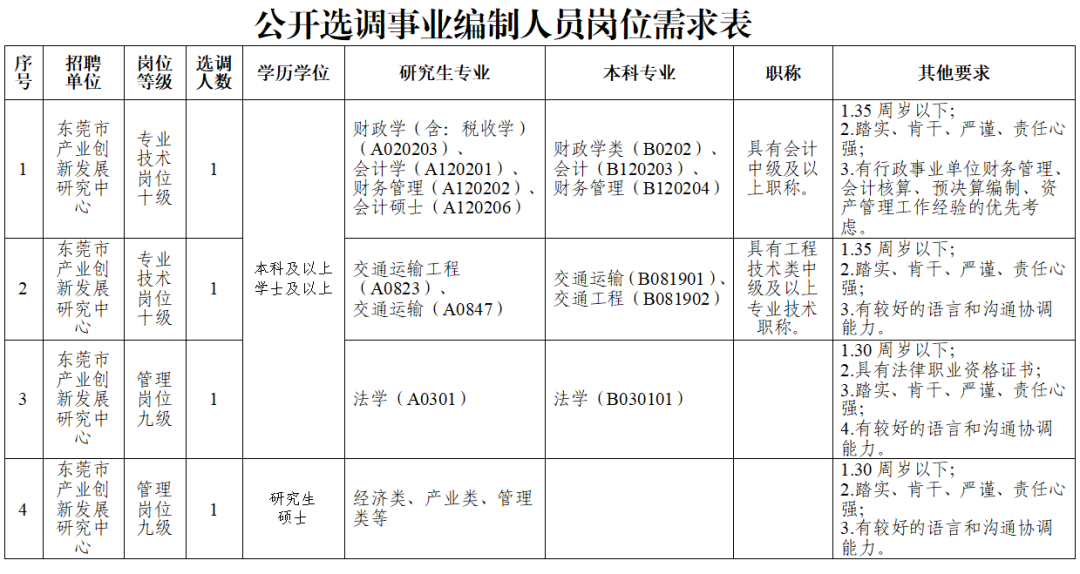 东莞市发展和改革局下属事业单位公开选调编制人员4名