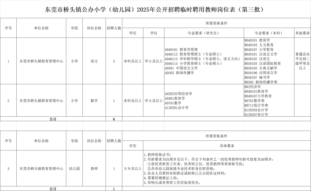 东莞市桥头镇公办学校招聘临时聘用教师6人