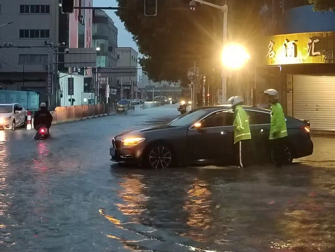 在积水涉水路段,公安交警迅速封闭路段,现场疏导交通,引导车辆绕行。