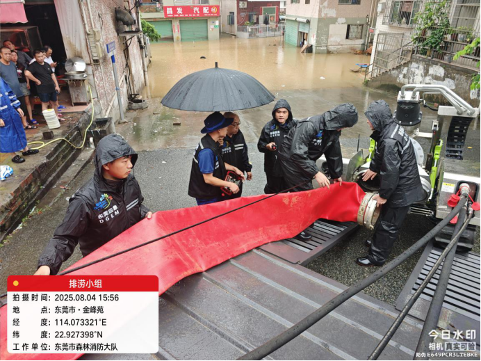 8月4日,受持续强降雨影响,樟木头镇部分区域出现严重积水险情。接上级指令后,东莞市森林消防大队立即启动应急响应机制,全体人员迅速集结排涝力量,调派大型排涝车、重型抽水泵、增压泵、消防水车等专业装备赶赴现场开展抢险救援工作。在镇相关部门协同配合下,经过数小时连续奋战,顺利完成该区域排涝任务,有效保障群众生命财产安全。