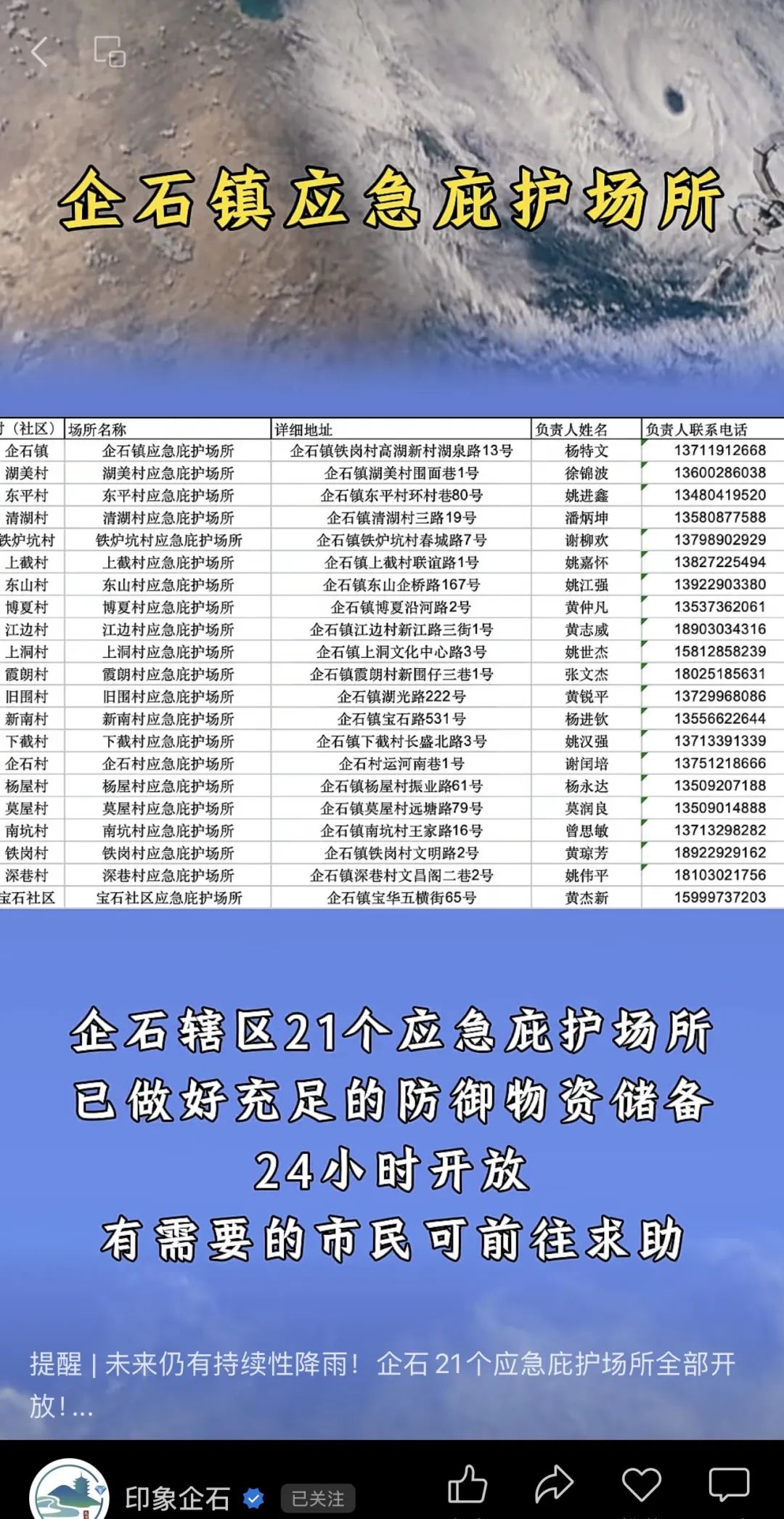 截至目前,已全面开放全镇21个应急庇护场所,共转移重点人员4人。为确保人民群众生命财产安全,镇内主要景区(虾公山森林公园、东清湖湿地公园、黄大仙公园、东江体育长廊公园)全部落实关停措施。