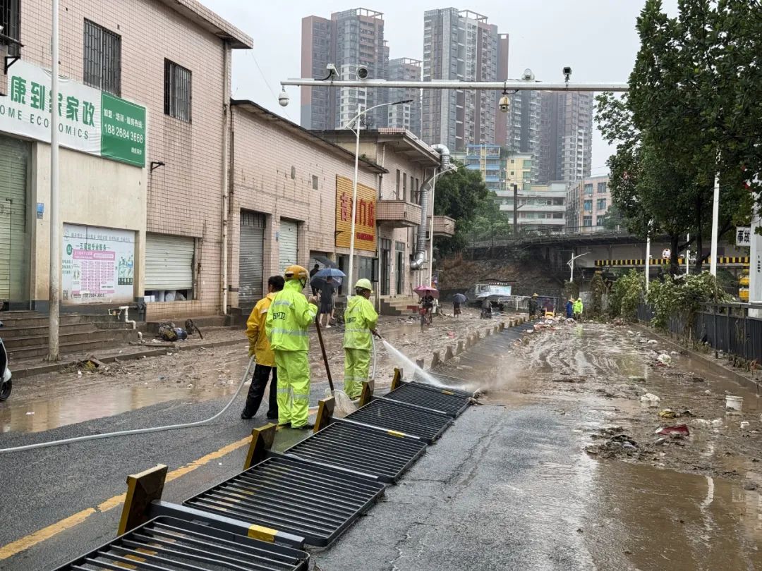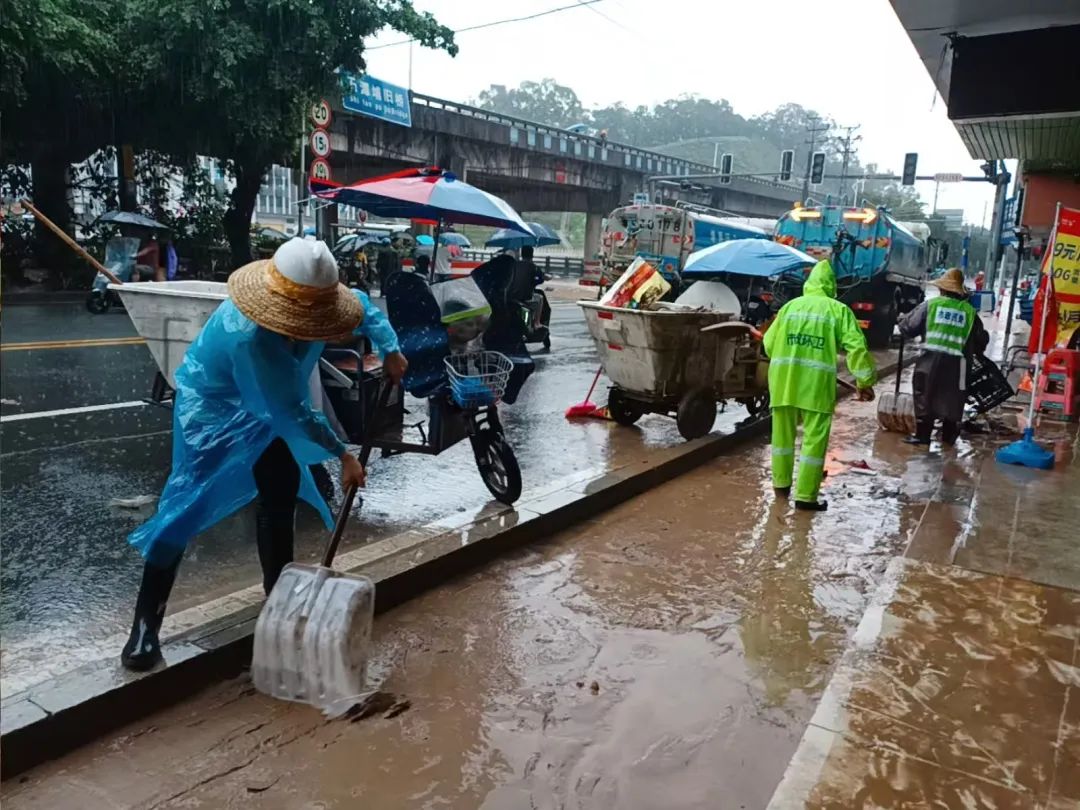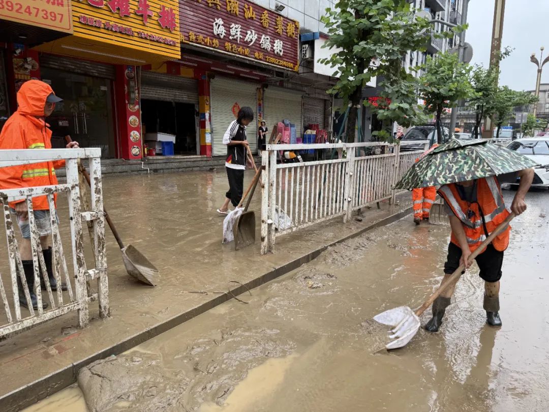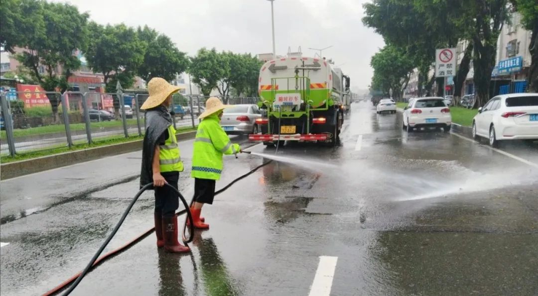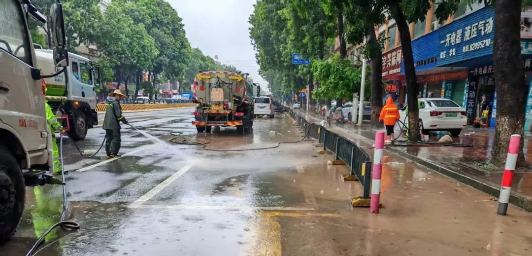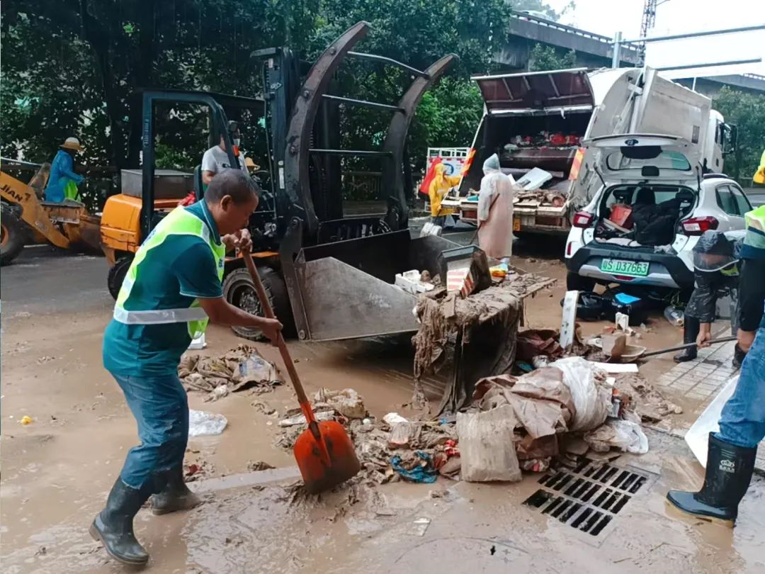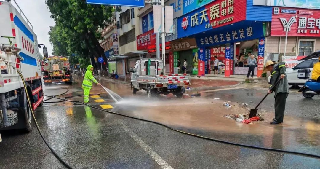 在积水较严重的塘厦大道、沿河路、塘龙路、花园新街、火车涵洞等路段,市政、环卫、城管执法等工作人员齐心协力,铲、车、手并用,全力清理道路上、围栏边的淤泥垃圾,并用洒水车对清理后的路面进行清洗清扫,加紧清除路面垃圾和障碍物,助力交通恢复。