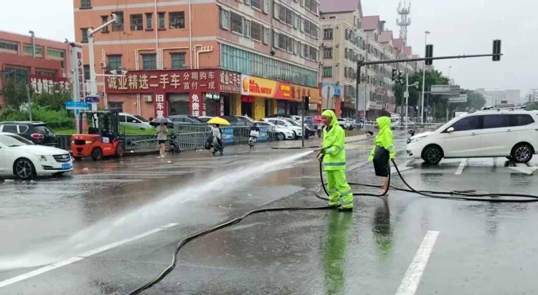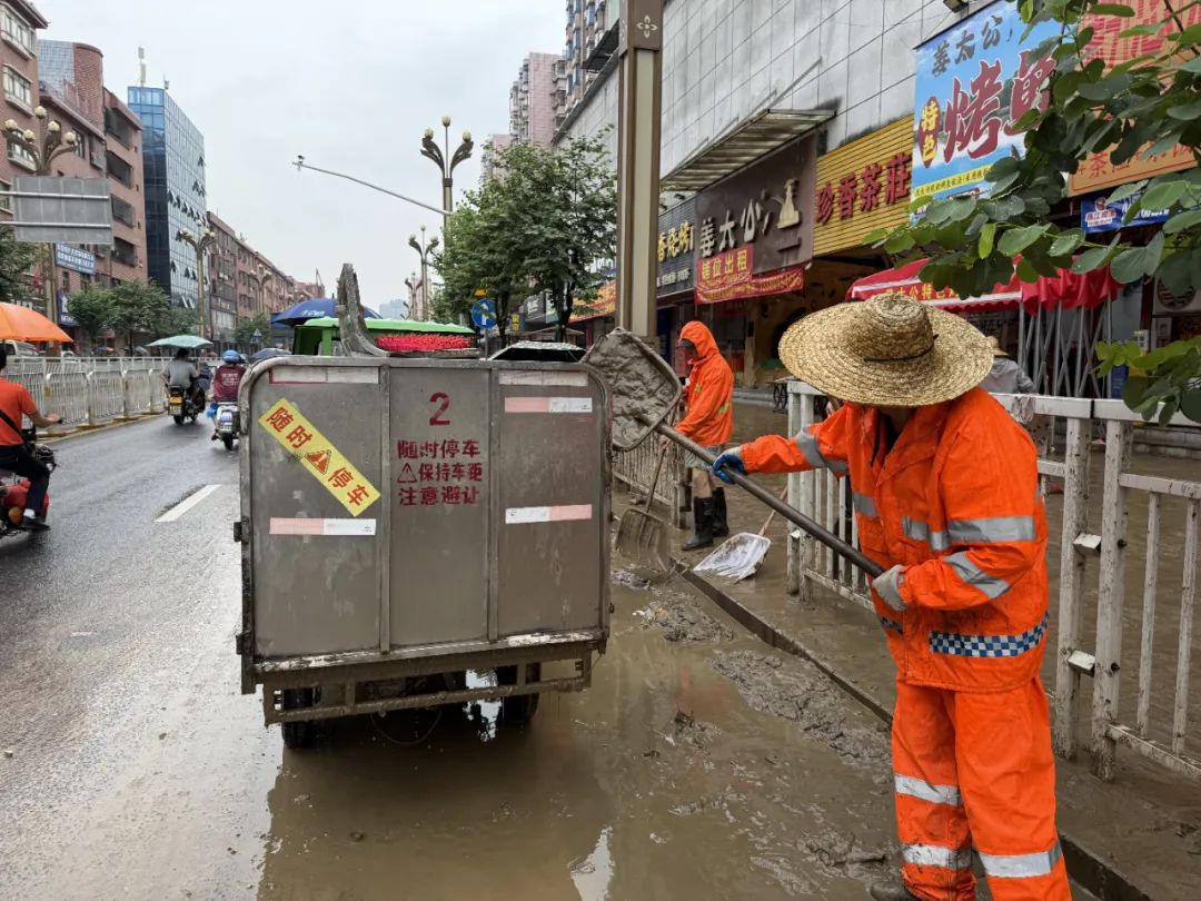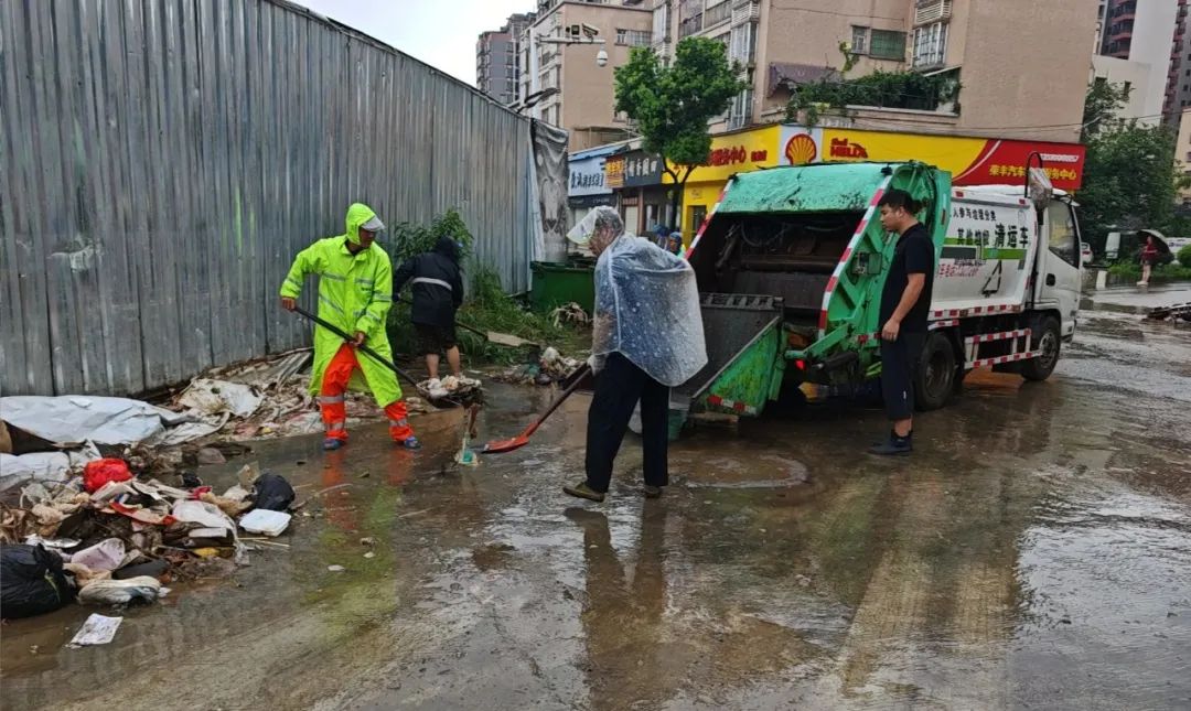 同时,环卫绿化工人也在加紧清理道路上的垃圾和淤泥。
