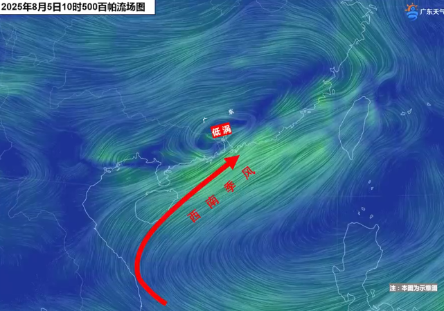 从8月5日上午的流场图可见,广东上空的低涡系统如同水泵,将西南季风抽上来,源源不断的西南暖湿气流为降雨提供“燃料”,带来持续性强降水。只要低涡不走,暴雨就不停。