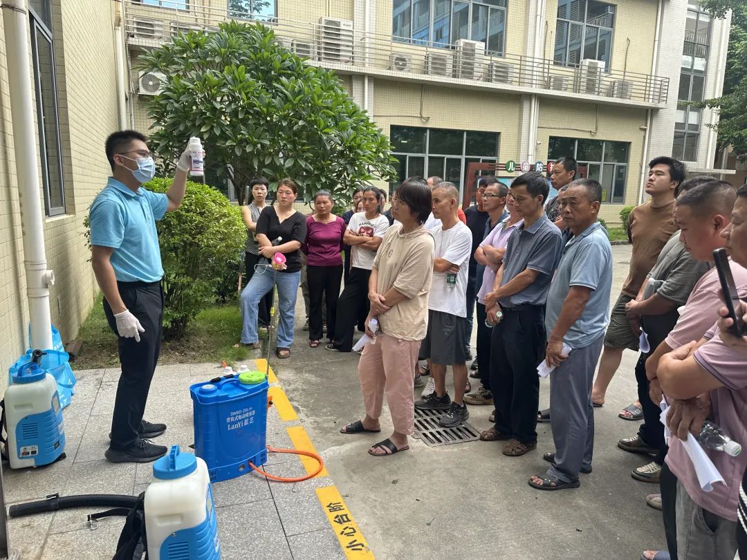 每一个细节都现场演示、逐个指导,确保站点负责人“学得会、用得对”。同时,针对楼道、墙角、草丛等蚊虫重点聚集区域,现场演示了差异化消杀处理技巧,确保药剂有效覆盖、不留死角。