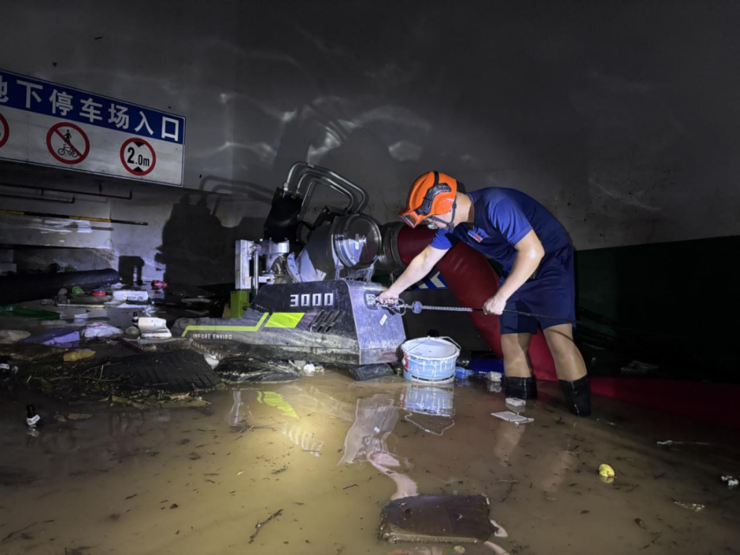 “我是党员,我来!”教导员谢明胜连续48小时坚守一线、靠前指挥,带领党员突击队冲锋在积水最深、险情最重的区域。班长梁锦山作为党员骨干,带领班组钻进漆黑的地下车库,冒着齐腰深的积水,“火力全开”不断抽排,争分夺秒恢复秩序。“这时候党员不带头,谁带头?”他笑着说。