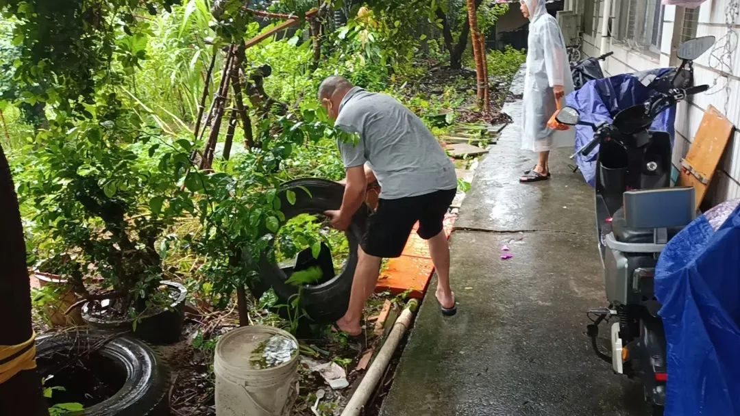 ▲滘联社区工作人员清理轮胎积水