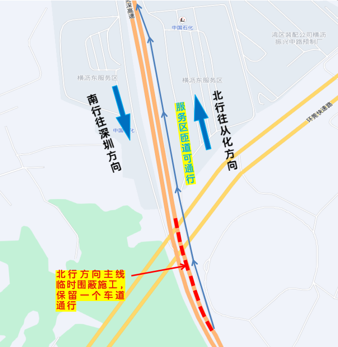 2.从莞高速(北行往从化方向)K87+000-K88+000段主线,占道施工期间主线保留一个车道间断性通行(施工期间主线剩余的一个通行车道采取间断性封闭,每次封闭时长约30分钟),可利用横沥东服务区匝道借道通行,北行方向管制期间南行(往深圳)方向不受影响,正常通行。