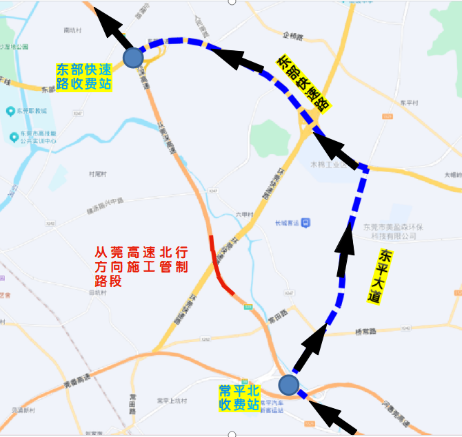 路线为:常平北收费站→东平大道→东部快速→东部快速路收费站→从莞高速