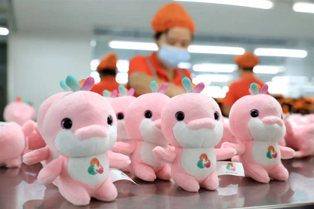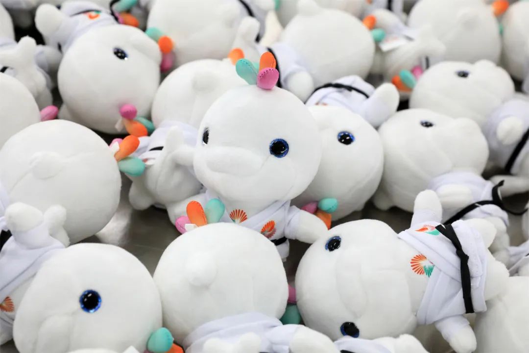 据悉,此次生产的吉祥物产品主要为20cm、50cm和挂件类的毛绒公仔。除了基本款、AI款,为了更好地展示“喜洋洋”与“乐融融”中华白海豚灵动可爱的形象,康达还设计了多个运动款式,以及在设计中融入了城市特色,目前已经推出25个款式。比如结合东莞是篮球和举重赛事的承办城市,康达设计了多个篮球和举重的相关款式;将分别代表广州、香港、澳门的木棉花、紫荆花、莲花融入设计当中;还设计了头顶三色小水花可以发光的功能款式。