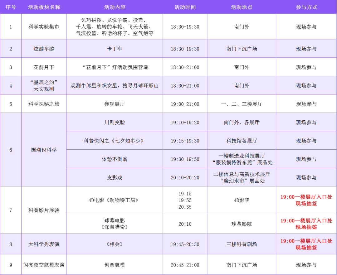 4.游客进入展厅后有机会通过现场抽签的形式获得一张当晚的大科学秀、4D电影或者球幕电影入场券(一个预约二维码只能抽1次),当晚19:00在一楼展厅入口处(扶手电梯旁)准时抽签,先到先得,派完即止。本次活动共安排1场大科学秀《相会》(200张券)、1场球幕电影(250张券),3场4D电影(每场次各50张券)。