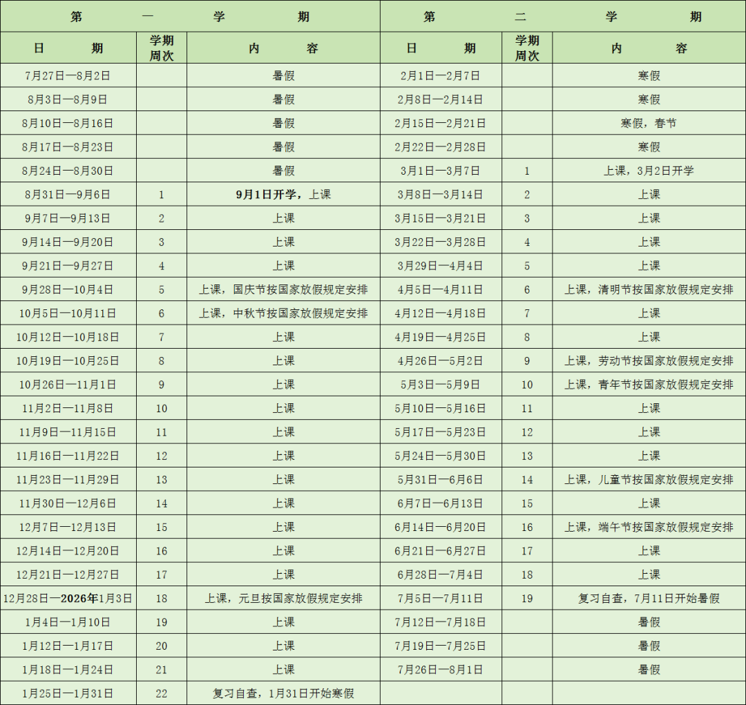 普通高中阶段:普通高中一、二年级9月1日开学(高中三年级8月1日开学),2026年2月7日开始放寒假,共计159天。