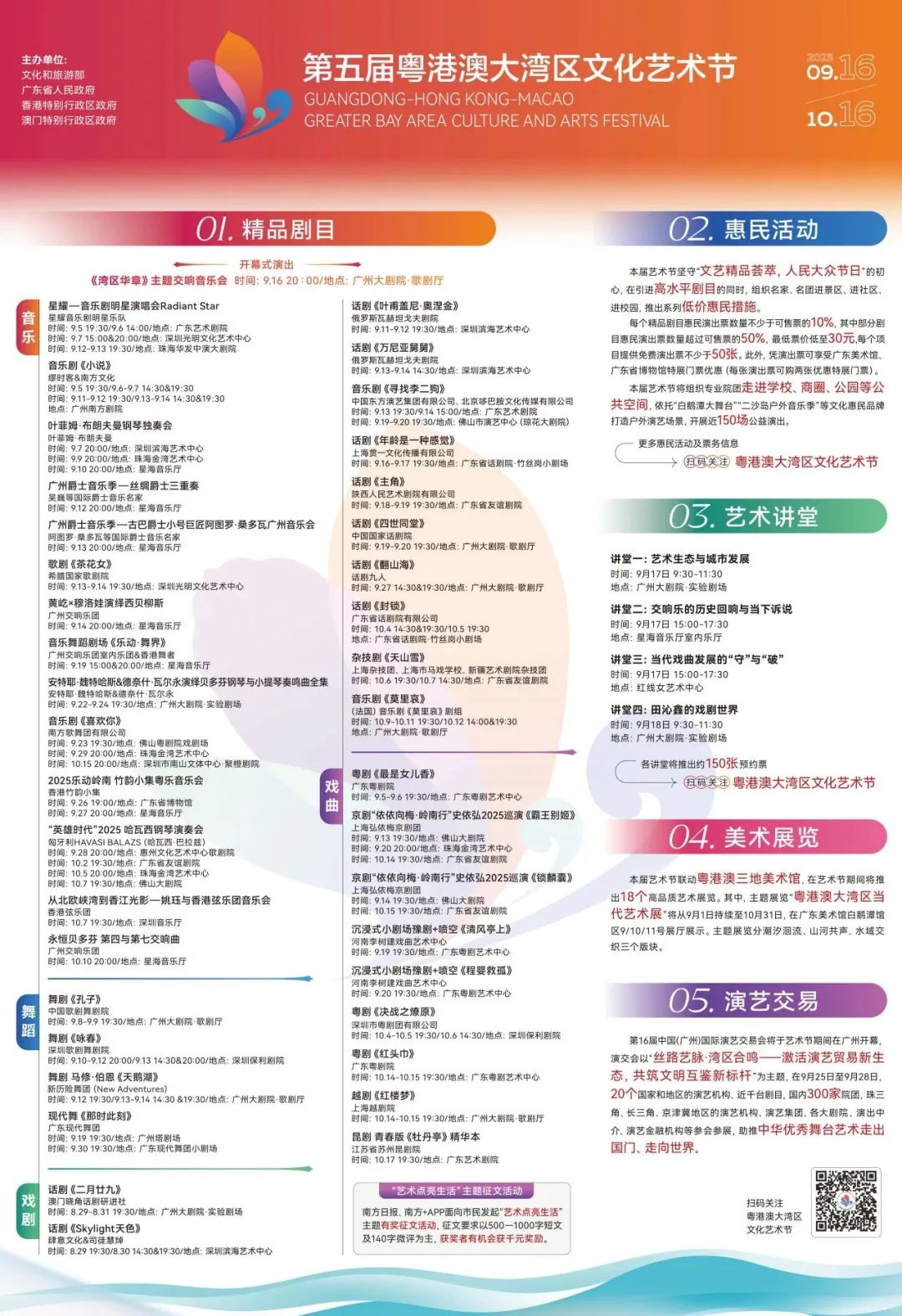 本届艺术节涵盖“艺汇湾区”剧目展演、“艺韵和鸣”艺术讲堂、“艺境共生”美术展览、“艺美生活”惠民活动及“艺彩交辉”演艺交易五大板块,包含超100场精品演出、18场艺术展览、近150场公益演出及系列艺术讲堂,将为大湾区民众献上一场全民共享的文化艺术盛宴。
