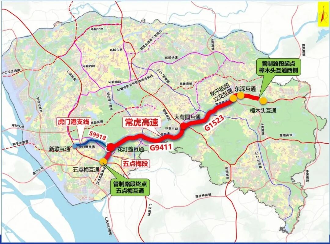 管制路段起点位于G1523甬莞高速樟木头互通西侧,终点为G9411莞佛高速五点梅互通。具体限速路段如下: