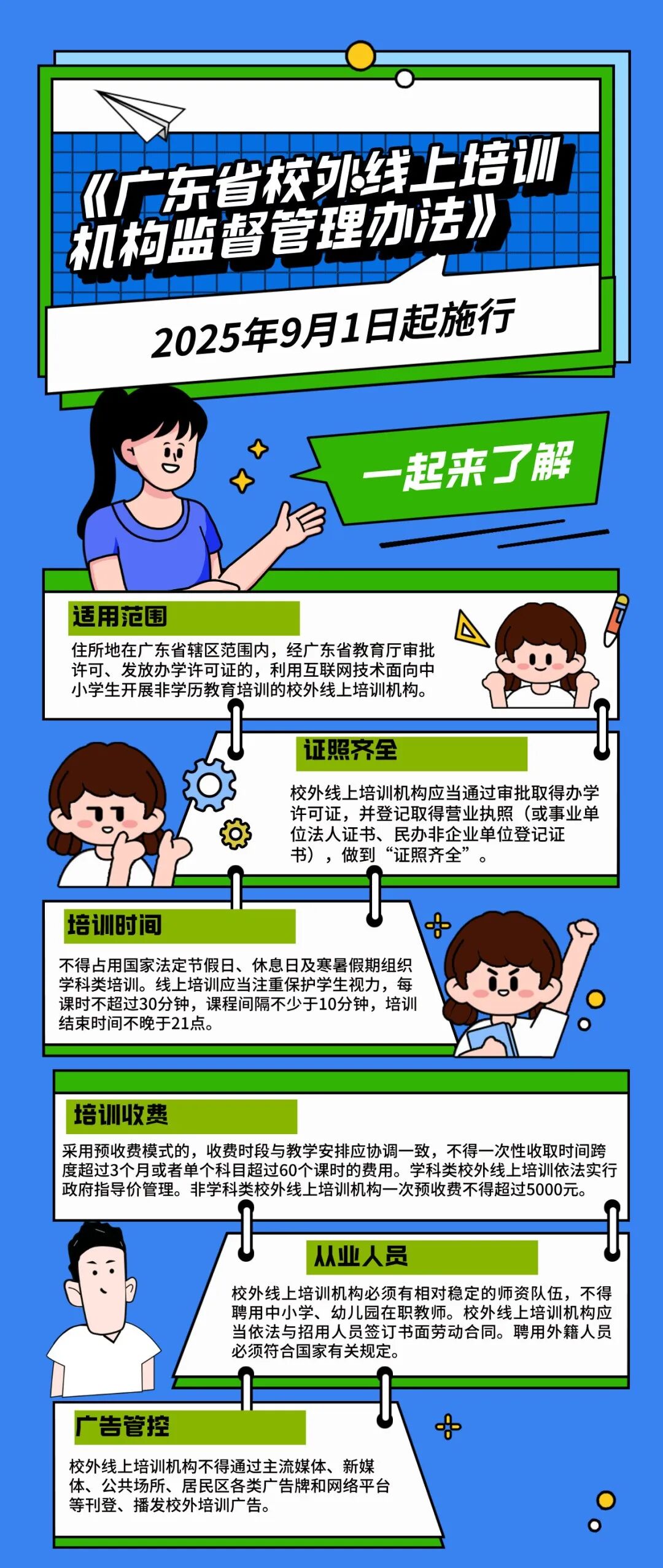 近日,省教育厅印发了《广东省校外线上培训机构监督管理办法》(以下简称《管理办法》),进一步规范校外线上培训机构的监督管理,提升我省校外线上培训机构规范办学水平。办法对住所地在广东省辖区范围内,经广东省教育厅审批许可、发放办学许可证的,利用互联网技术面向中小学生开展非学历教育培训的校外线上培训机构的党建工作、培训内容、培训时间、培训收费、从业人员等方面提出要求。办法自2025年9月1日起施行,有效期5年。