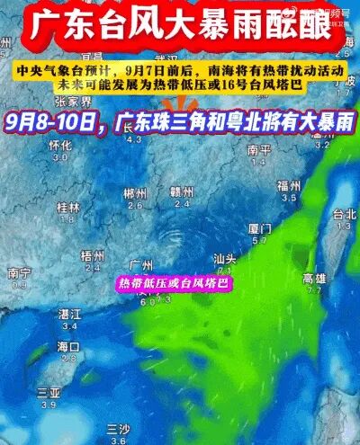 据深圳卫视消息,南海热带扰动未来可能发展为热带低压或16号台风“塔巴”。受此影响,9月8-10日,广东珠三角地区和粤北将迎来暴雨大暴雨。