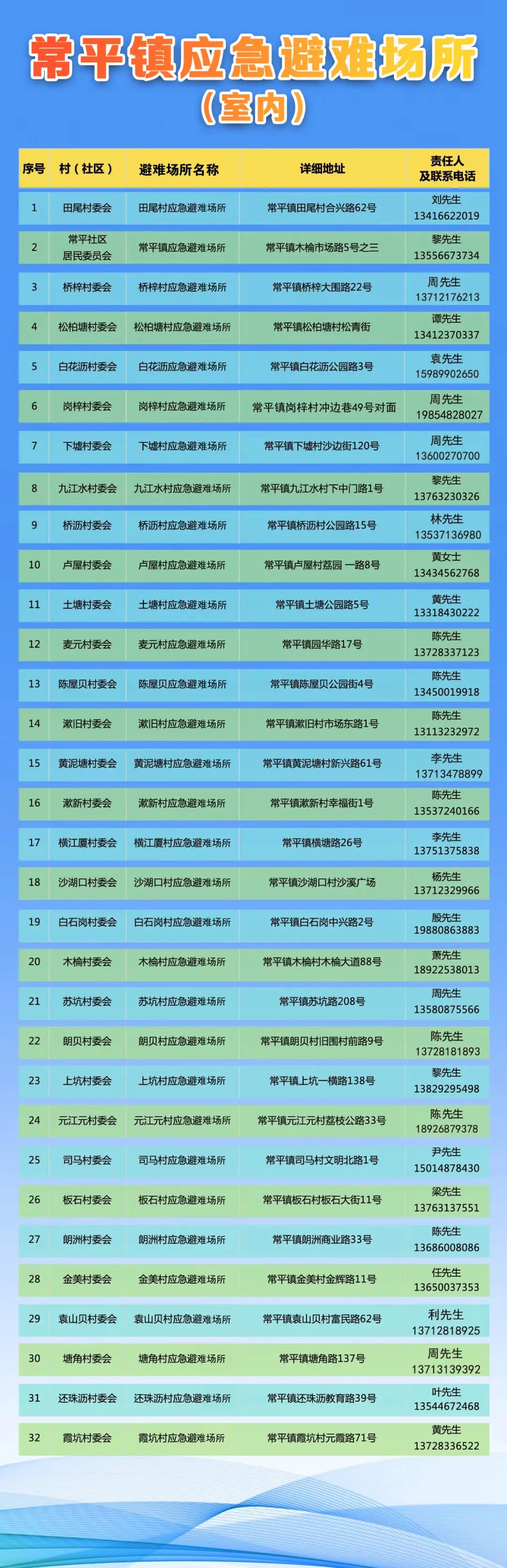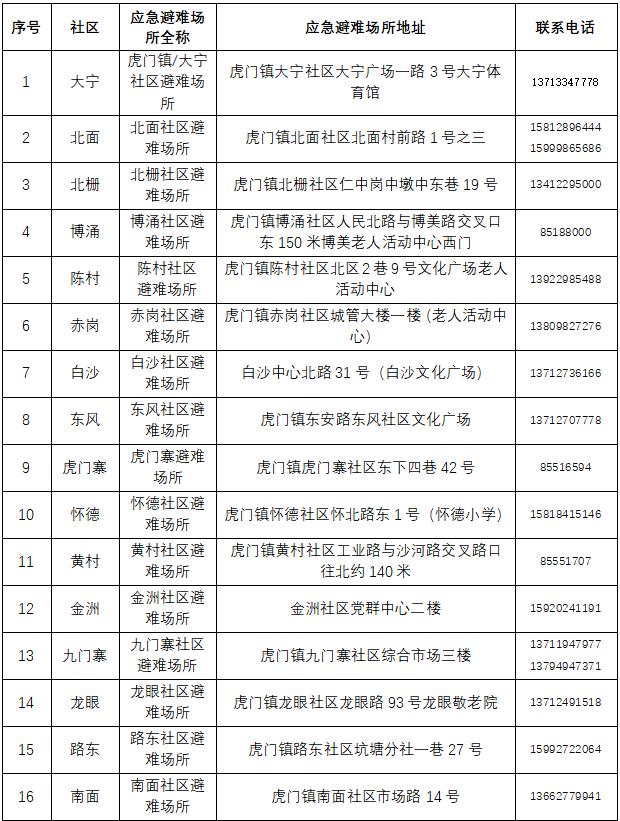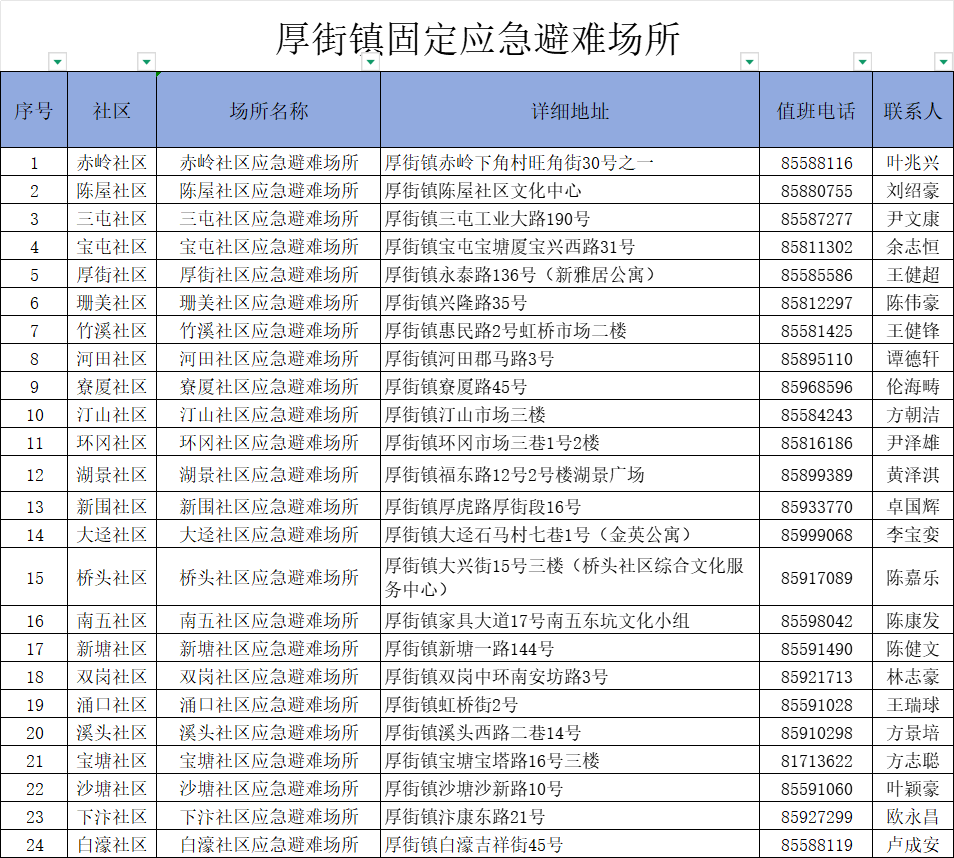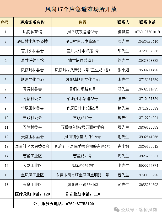 目前,凤岗镇17个应急避难场所已经开放,有需要的群众可就近到以下避难场所↓↓