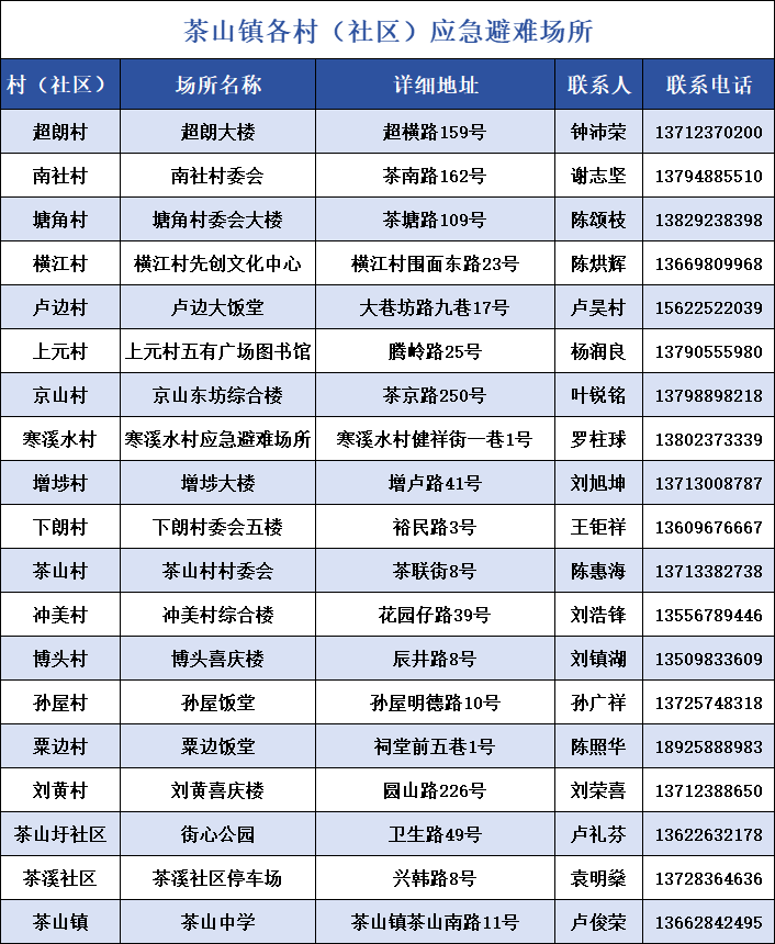 目前,茶山镇19个应急避难场所已全部对外开放。