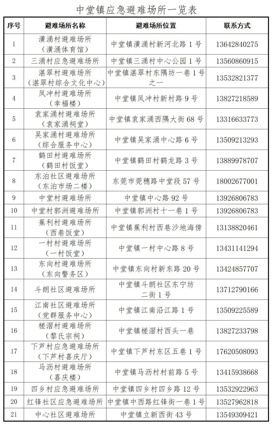 目前,中堂镇21个应急避难场所已全部对外开放。