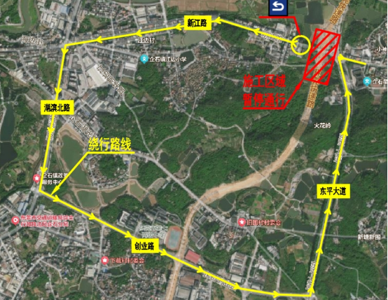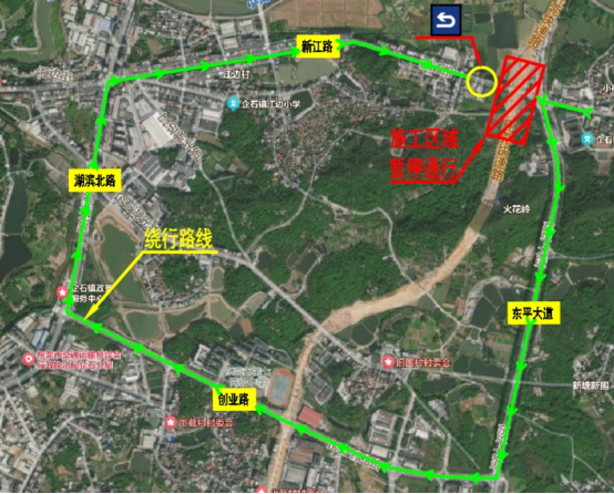 2、上洞村至江边村方向,可沿东平大道→创业路→湖滨北路→新江路绕行。