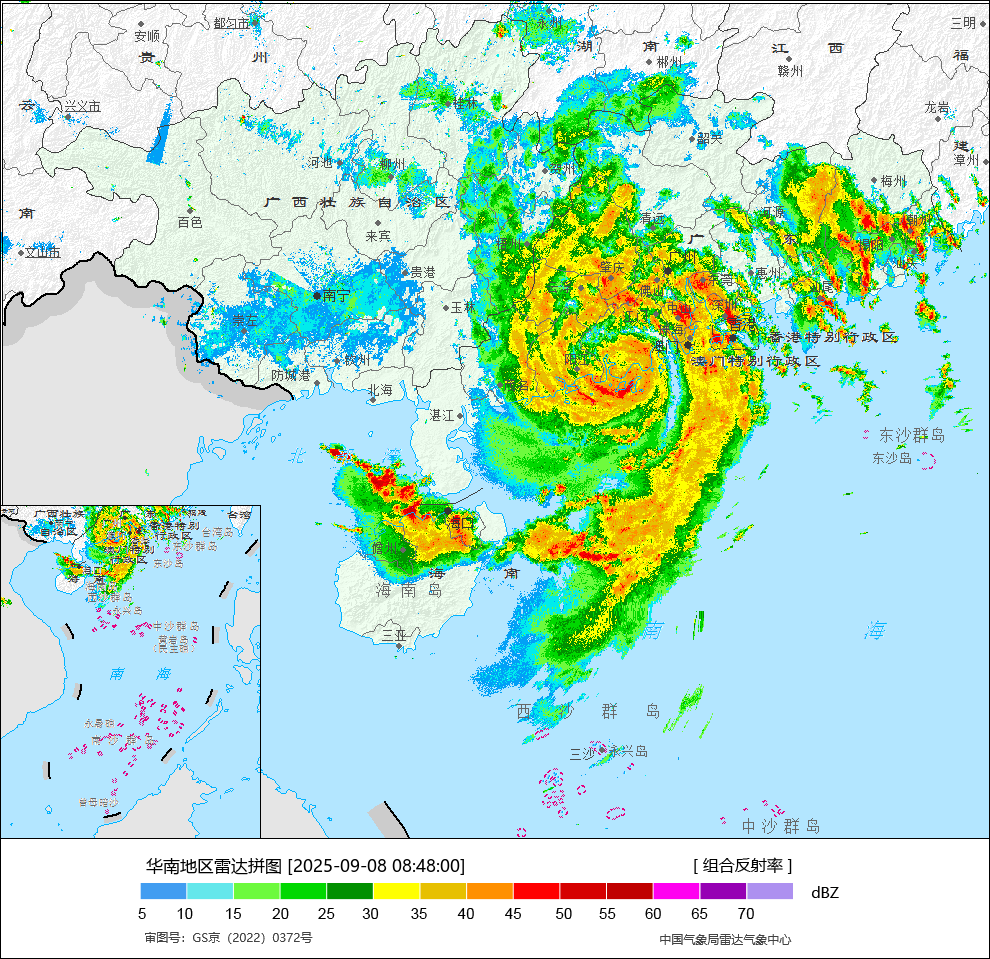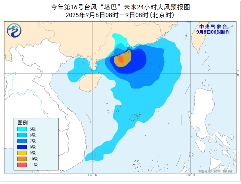 大风预报:9月8日08时至9日08时,南海北部和中部、北部湾、琼州海峡、西沙群岛部分海域、中沙群岛附近海域、广东沿海、珠江口区、海南岛北部沿海、广西沿海将有6至7级大风,其中南海北部的部分海域和广东中西部沿海风力可达8至10级,台风中心经过的海域或地区风力可达11级,阵风12至13级。