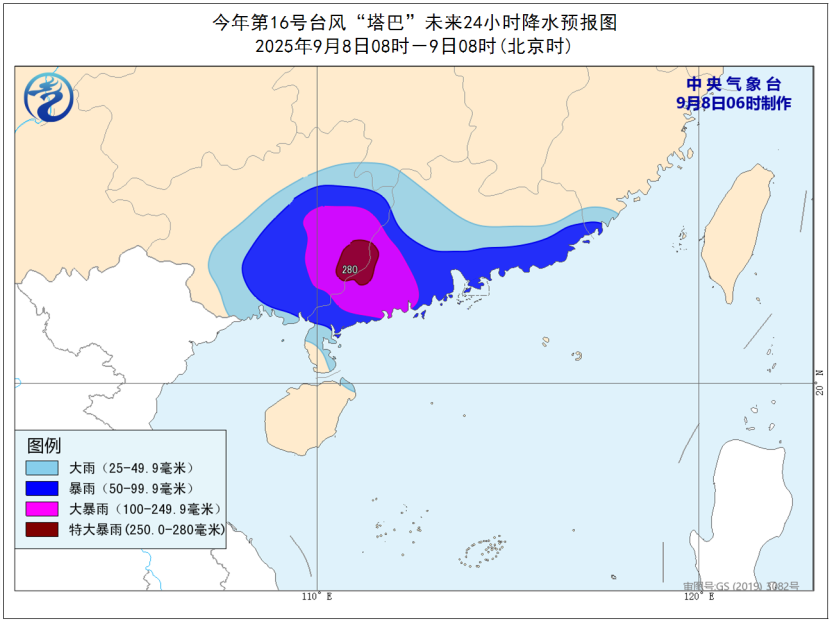 降水预报:9月8日08时至9日08时,广东中南部、广西中东部有大到暴雨,其中,广西东部、广东西南部等地部分地区有大暴雨,局地有特大暴雨(250至280毫米)。