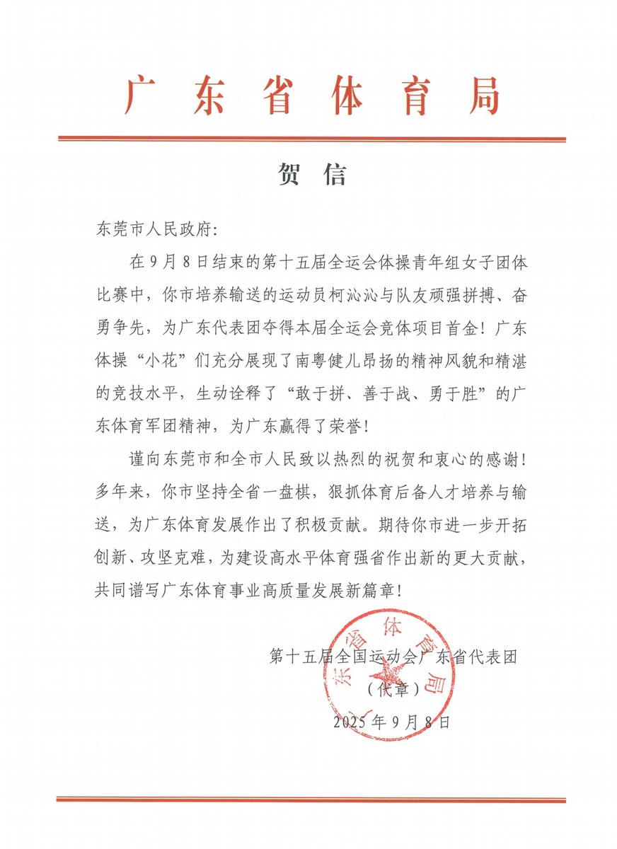 赛后,广东省体育局向东莞市人民政府发来贺信,“你市培养输送的运动员柯沁沁与队友顽强拼搏、奋勇争先,为广东代表团夺得本届全运会竞体项目首金!广东体操‘小花’们充分展现了南粵健儿昂扬的精神风貌和精湛的竞技水平,生动诠释了‘敢于拼、善于战、勇于胜’的广东体育军团精神,为广东赢得了荣誉!”