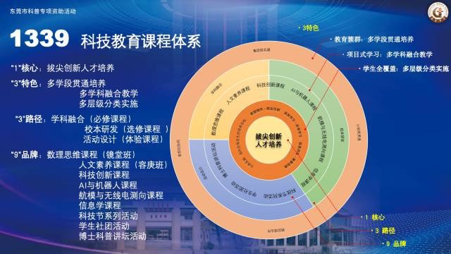 课程建设方面,东莞中学在“1339”科技教育课程体系下,以拔尖创新人才培养为核心,基于分层培养分类实施理念,构建了“2段×2阶”人工智能课程,即初、高中两个学段,普及课程与提高课程同时开展,以系统思维探索人才贯通培养。截至目前,该课程培养的学生共获国家级奖项9项、省级奖项12项、市级奖项68项。