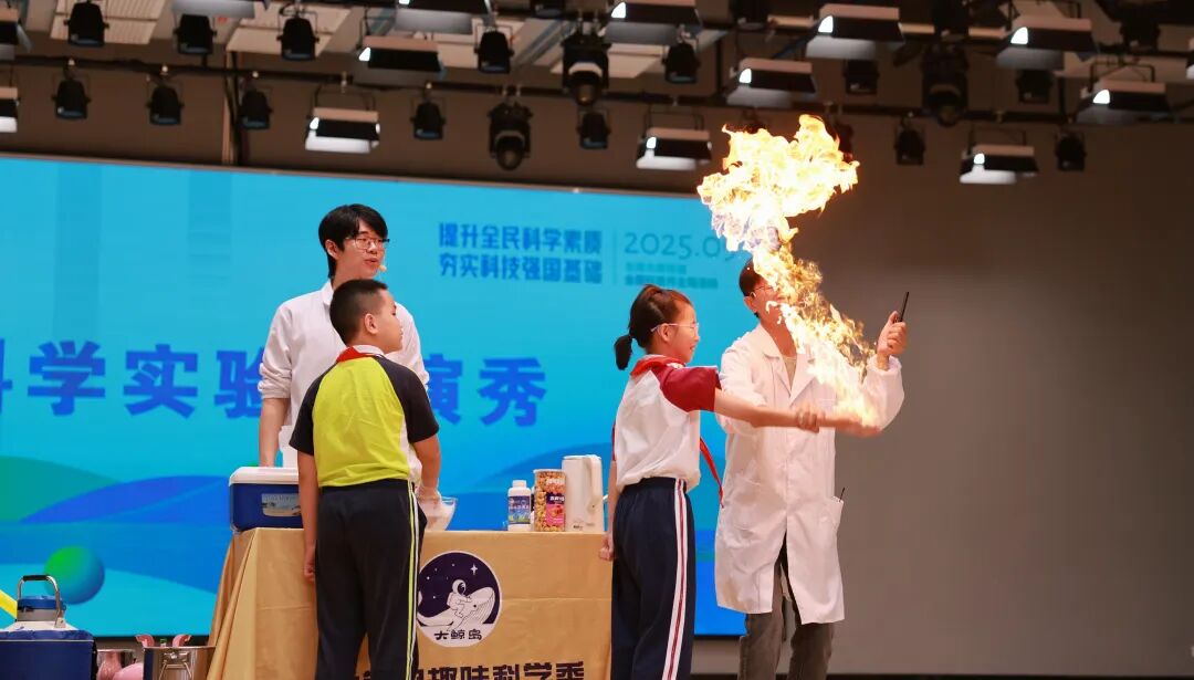 大型科学实验表演秀更是将活动现场氛围推向高潮。科学实验表演秀上,两位身穿白大褂的科普老师以相声的方式,为同学们带来了许多奇妙有趣的小实验。