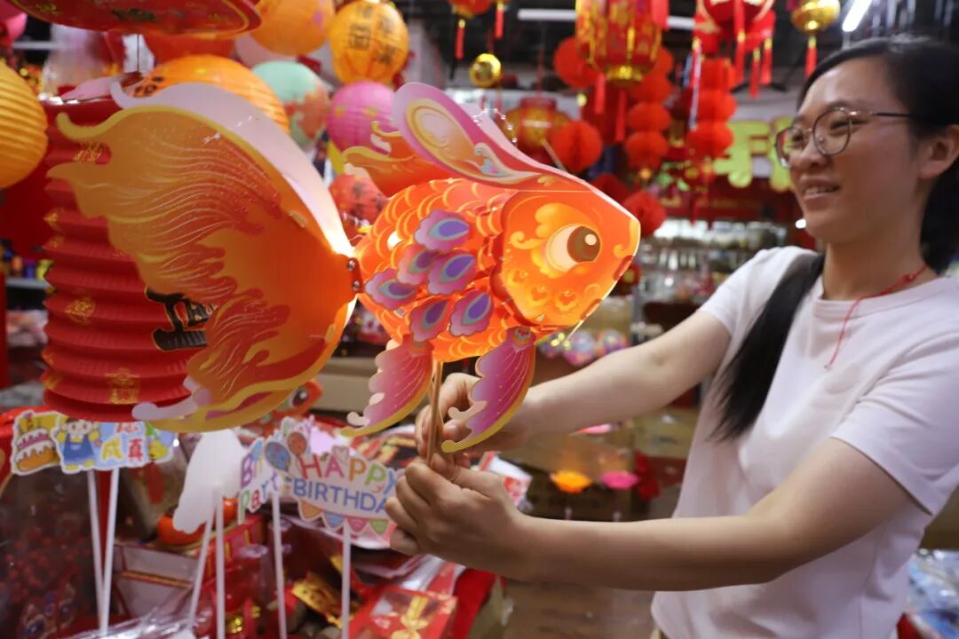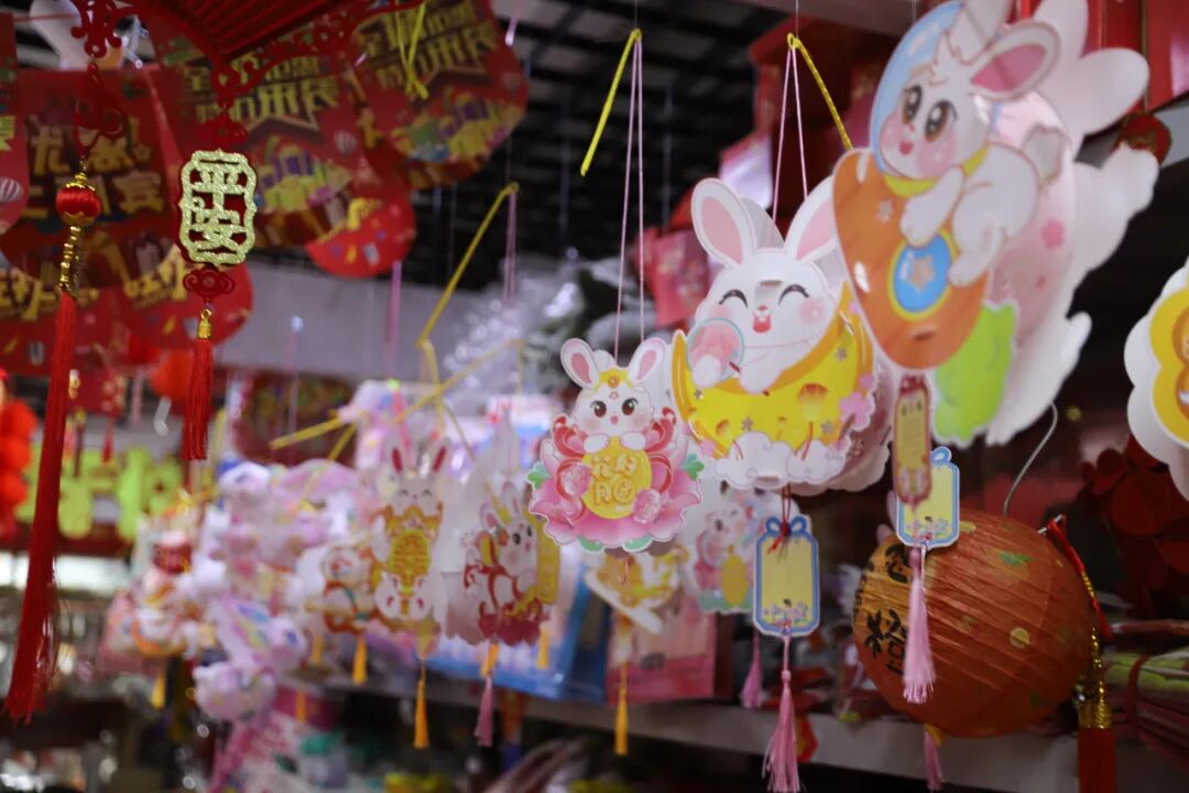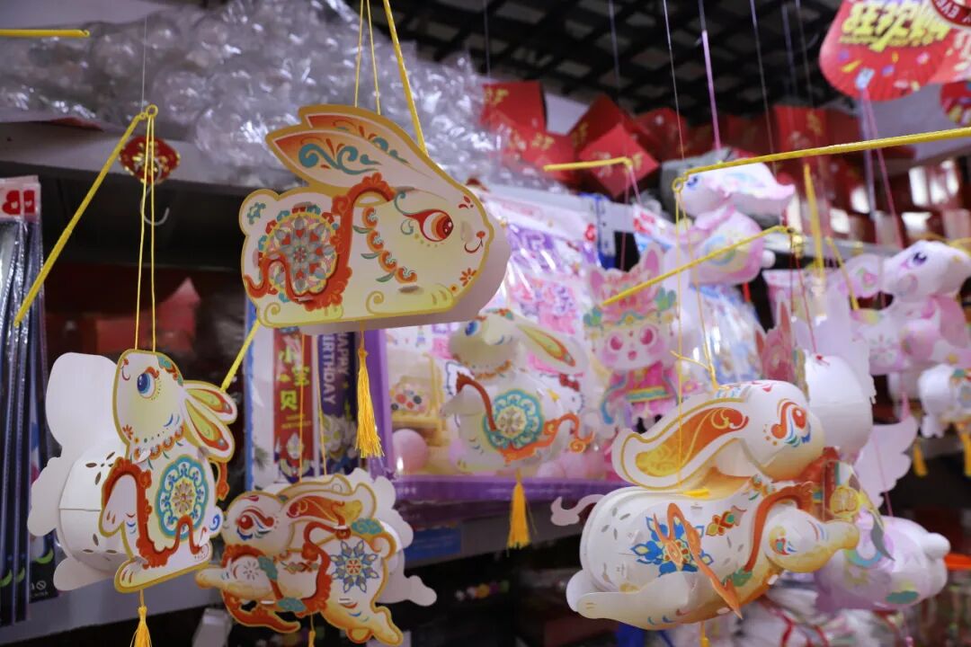 在万江义乌小商品商贸城二楼的喜庆用品批发市场,多家商铺早已挂起琳琅满目的灯笼。除了经典纸质款式,今年的灯笼在材质与造型上更为丰富多样,兔子、“Hello Kitty”、蝴蝶等形象应有尽有。其中一款可背式的“蝴蝶”灯笼,是今年的爆款,孩子们可以将其背在身上,以奔跑的形式带着发光的蝶翼轻轻扇动,很是有趣。据店主介绍,这款灯笼刚上架就卖得很好,孩子们觉得新奇有趣,背着跑能更吸引人们的目光,家长也乐意给孩子买,增添游园时候的乐趣。