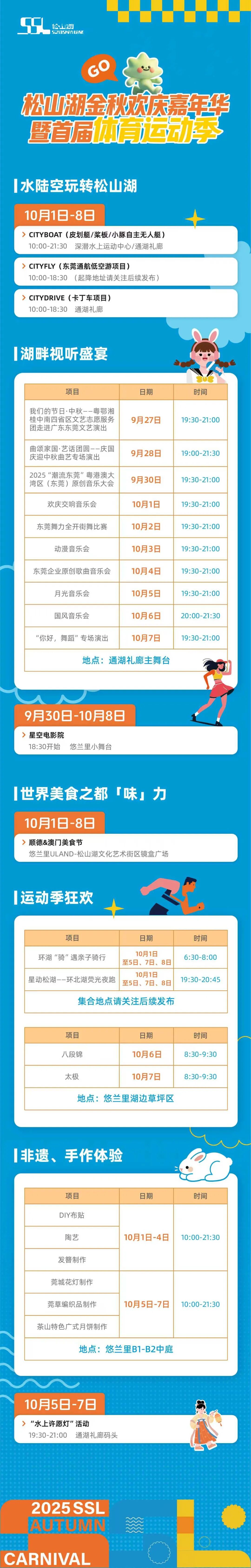 中国文联综艺晚会等10场精彩文艺演出,无人艇、卡丁车、、低空飞行“水陆空”玩转松湖。顺德澳门美食节、夜跑、晨骑、八段锦、太极、攀岩等潮流运动,手作月饼、花灯制作、、莞草编织等非遗体验在松山湖悠兰里和通湖礼廊举行。松山湖金秋欢庆嘉年华暨首届体育运动季将文艺、国潮、活力、潮趣通通全打包!跟着小编提前探秘松山湖金秋欢庆嘉年华的N种打开方式!