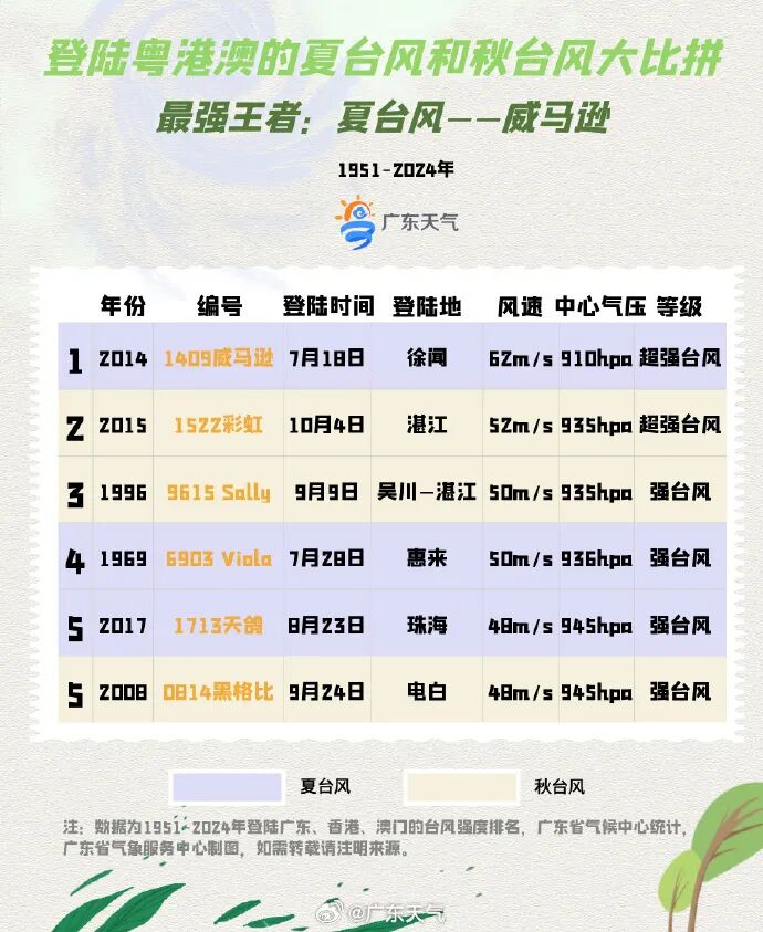 7-9月粤港澳最易遇到台风登陆,夏台风主要在7月中下旬发力,秋台风则偏爱9月上旬出击。这74年间,共有221个台风登陆粤港澳,其中:夏台风有137个(占62%),秋台风有76个(占34.4%)。