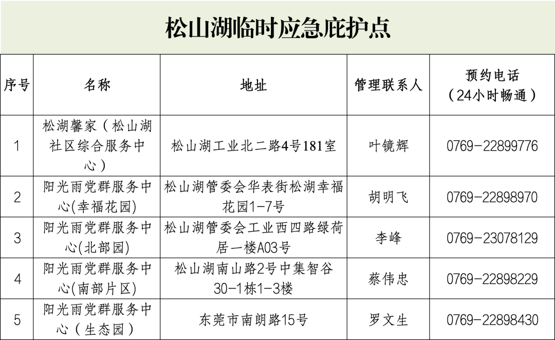 目前,松山湖5个临时庇护点已全面开放,为需要防汛避难的市民群众提供帮助。需要暂住的群众,可就近到以下应急庇护场所寻求帮助。