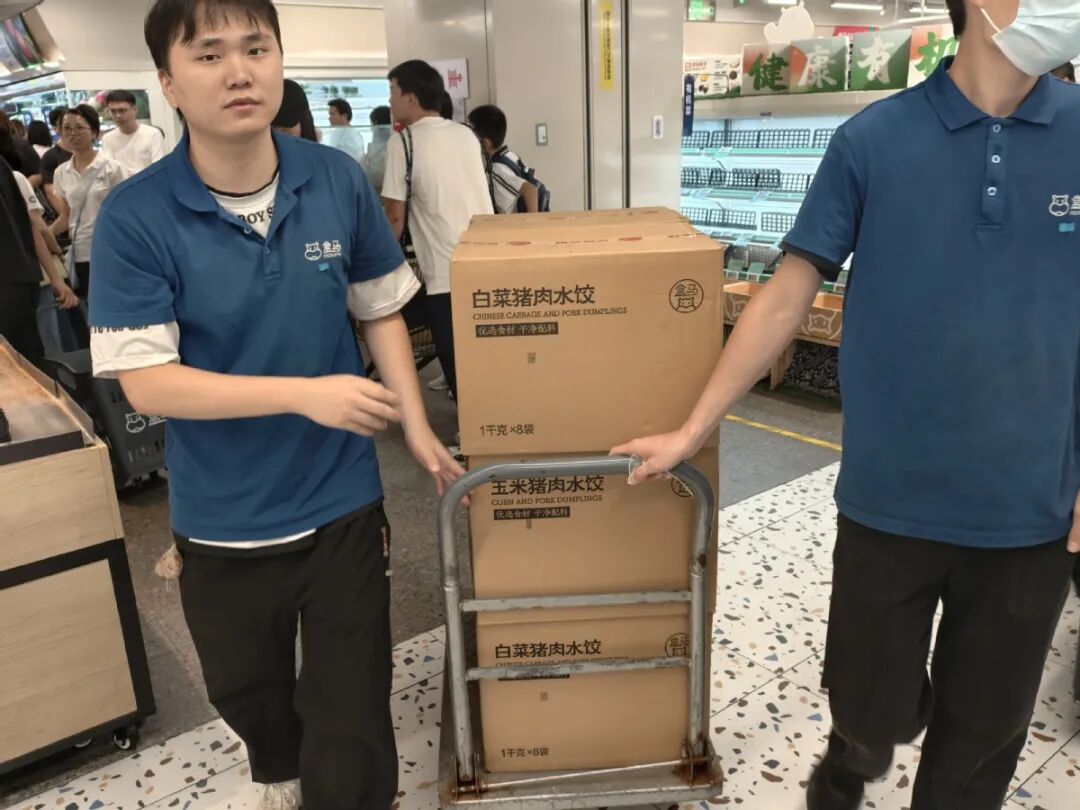 9月22日晚,记者走访东莞盒马门店发现,店内肉禽蛋菜奶、米面粮油等民生商品货架满满当当,工作人员正忙着补货、整理物资,为台风期间市民生活需求做足准备。