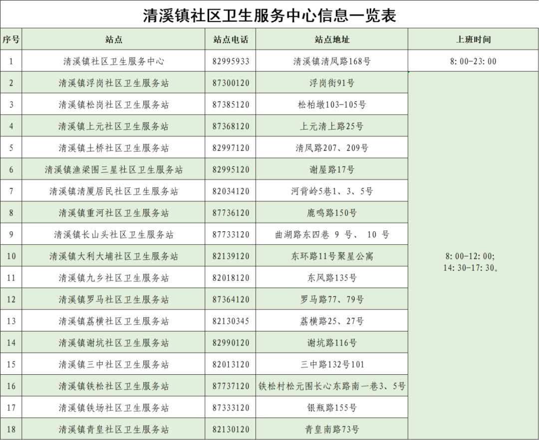 1、各站点服务安排。9月23日-25日清溪镇社区卫生服务中心及各社区卫生服务站正常开诊,其中:健康大楼社卫中心门诊服务时间为8:00-23:00;各社区卫生服务站服务时间为8:00-12:00;14:30-17:30。