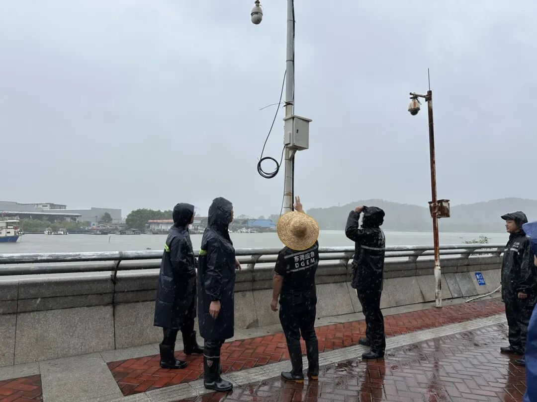 应急、公安、城管等有关部门人员和新湾社区工作人员落实太平水道沿线巡查工作,重点检查堤岸、防潮拍门、雨水井、小艇码头、亲水平台等点位,观察太平水道水位,检查雨水井周围的防汛沙袋的堆放情况,对堵塞雨水井的断枝进行清理,全力减少台风期间风雨和海水倒灌等造成的影响。