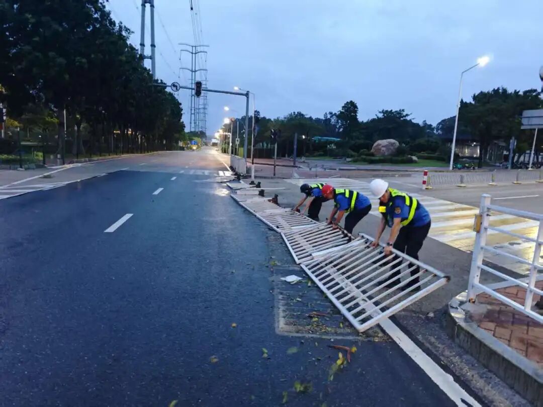 城管人员坚守一线,加强动态巡查。他们在风雨中合力将市政道路中间被大风掀翻的沉重护栏一段段扶起、固定,快速消除道路交通安全隐患,保障风雨中的道路畅通;及时将大风刮断的树枝清理至安全地带,并对存在倾倒隐患的树木做好警示,同步通知应急队伍快速处置,并通过主动排查与快速响应,有效防范次生灾害,守护城市安全运行。