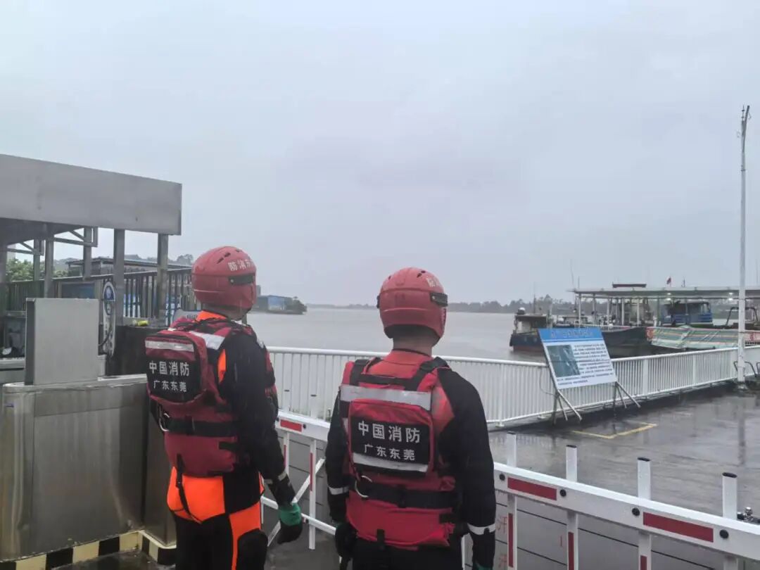 虎门消防救援大队前往新湾海鲜市场开展前置执勤,观察潮水情况,并对车辆器材装备进行检查,时刻做好救援。