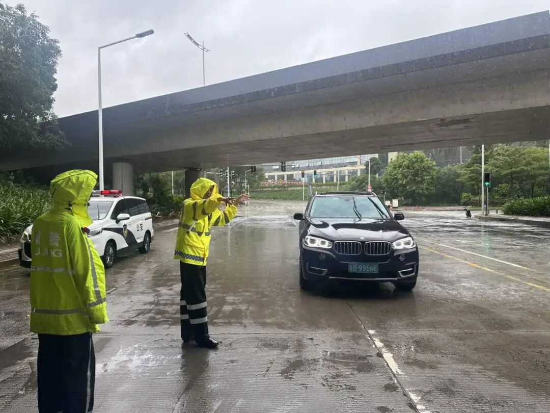 虎门交警大队在辖区重点路段,对过往车辆进行安全提示与交通疏导,并实施必要的管控措施。同时,加强对桥梁、低洼地带等易涝点的巡逻频次,密切监控水情,提前防范可能因积水引发的次生灾害。